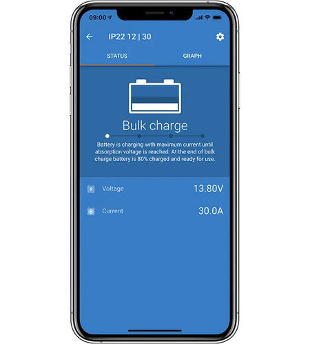 A solar charger gathers energy from your solar panels, and stores it in your batteries. Using the latest, fastest technology, SmartSolar maximises this energy-harvest, driving it intelligently to achieve full charge in the shortest possible time. SmartSolar maintains battery health, extending its life.